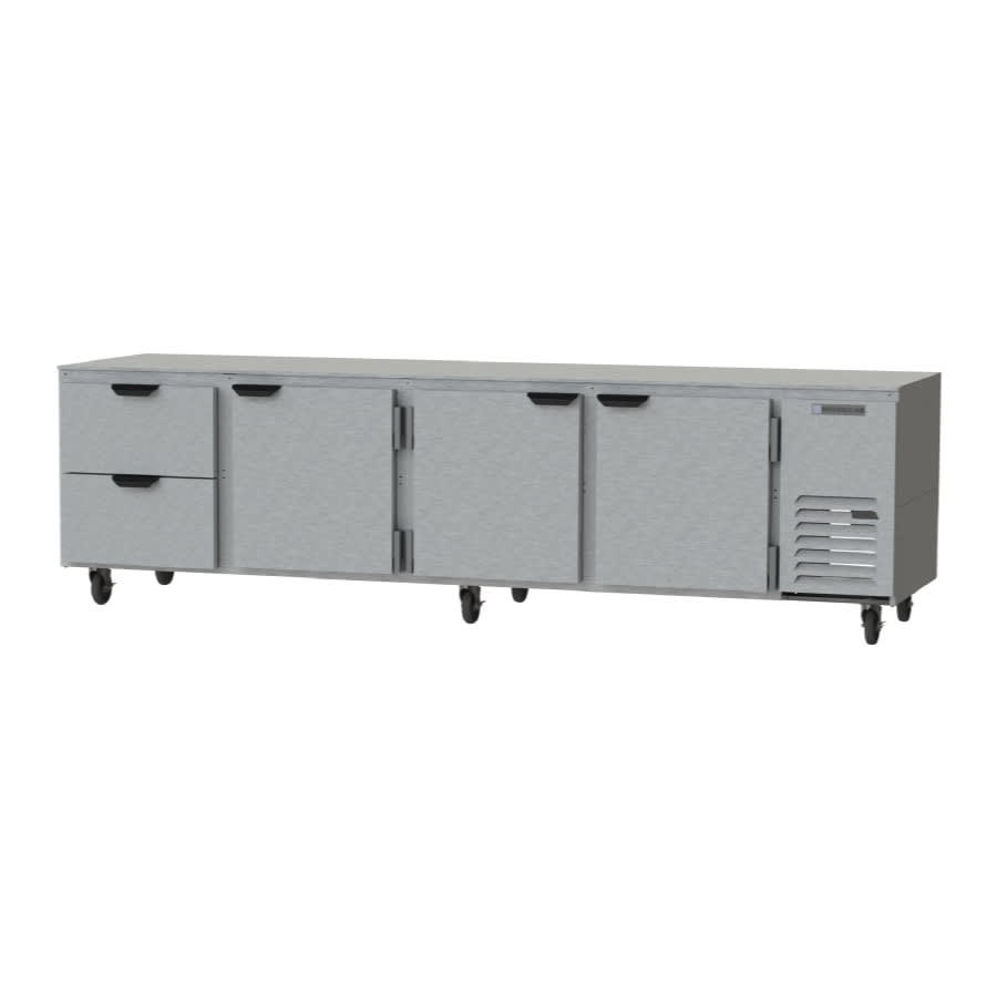Undercounter Refrigerator, four-section, 119″W, 52.5 cu. ft., (2) drawers & (3) doors, (6) shelves, stainless steel exterior & top, aluminum interior, side-mounted self-contained refrigeration, R290 Hydrocarbon refrigerant, 1/3 HP, UL, cUL, UL EPH, MADE IN USA, 115v