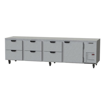 Undercounter Refrigerator, four-section, 119″W, 52.5 cu. ft., (6) drawers & (1) doors, (2) shelves, stainless steel exterior & top, aluminum interior, side-mounted self-contained refrigeration, R290 Hydrocarbon refrigerant, 1/3 HP, UL, cUL, UL EPH, MADE IN USA, 115v/60/1ph