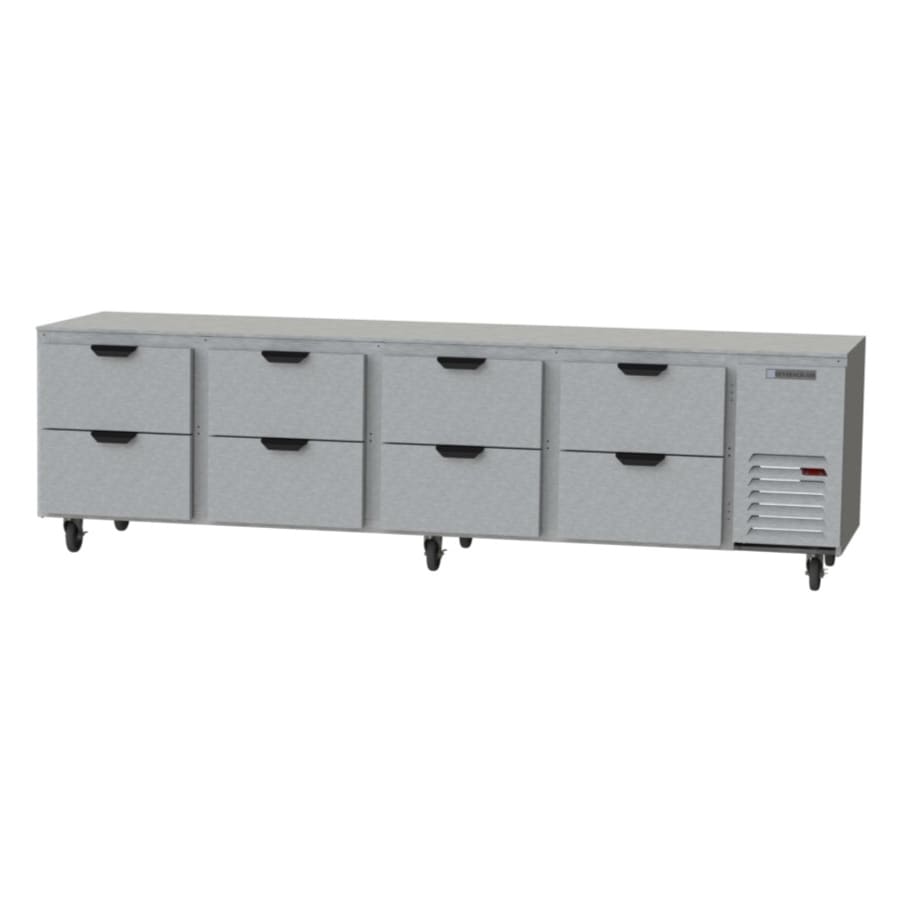 Undercounter Refrigerator, four-section, 119″W, 52.5 cu. ft., (8) drawers, stainless steel exterior & top, aluminum interior, side-mounted self-contained refrigeration, R290 Hydrocarbon refrigerant, 1/3 HP, UL, cUL, UL EPH, MADE IN USA, 115v/60/1ph