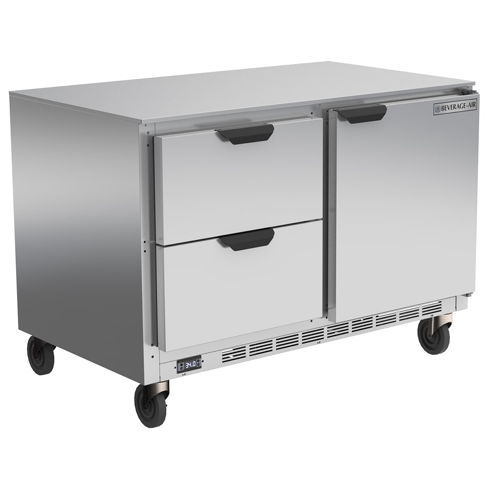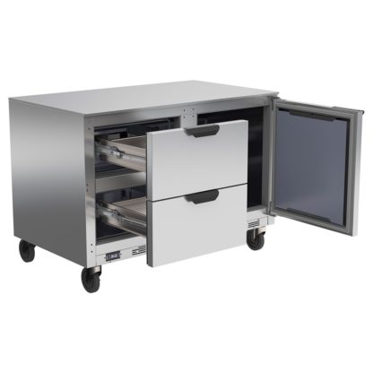 Undercounter Refrigerator, two-section, 48″W, 13.9 cu. ft., (2) drawers & (1) door, (2) shelves, stainless steel exterior & top, aluminum interior, rear-mounted self-contained refrigeration, R290 Hydrocarbon refrigerant, 1/6 HP, UL, cUL, UL EPH, MADE IN USA, 115v/60/1ph