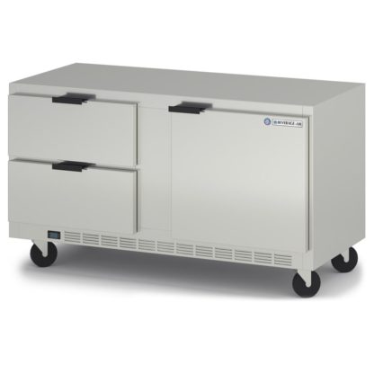 Undercounter Refrigerator, two-section, 60″W, 17.1 cu. ft., (2) drawers (1) door, (2) shelves, stainless steel exterior & top, aluminum interior, rear-mounted self-contained refrigeration, R290 Hydrocarbon refrigerant, 1/5 HP, UL, cUL, UL EPH, MADE IN USA, 115v/60/1ph