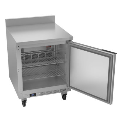 Worktop Freezer, one-section, 27″W, 6.13 cu. ft. capacity, (1) solid door, (2) shelves, snap-in door gaskets, stainless steel front, 2-1/2″ thick top & sides, galvanized steel exterior back and bottom, aluminum interior, 4″ removable backsplash, rear-mounted self-contained refrigeration, R290 Hydrocarbon refrigerant, 1/4 HP, cULus, UL EPH Classified, UL-Sanitation, Made in USA