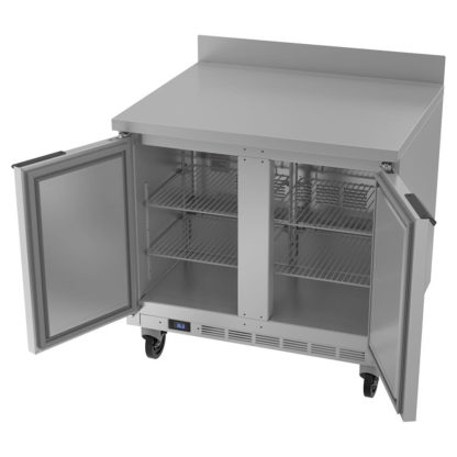 Worktop Freezer, two-section, 36″W, 8.69 cu. ft., (2) solid doors, (4) shelves, snap-in door gaskets, stainless steel front, 2-1/2″ thick top & sides, aluminum interior, 4″ removable backsplash, rear-mounted self-contained refrigeration, R290 Hydrocarbon refrigerant, 1/2 HP, cULus, UL EPH Classified, UL-Sanitation, Made in USA