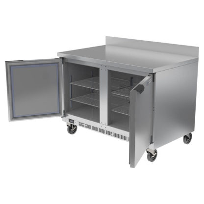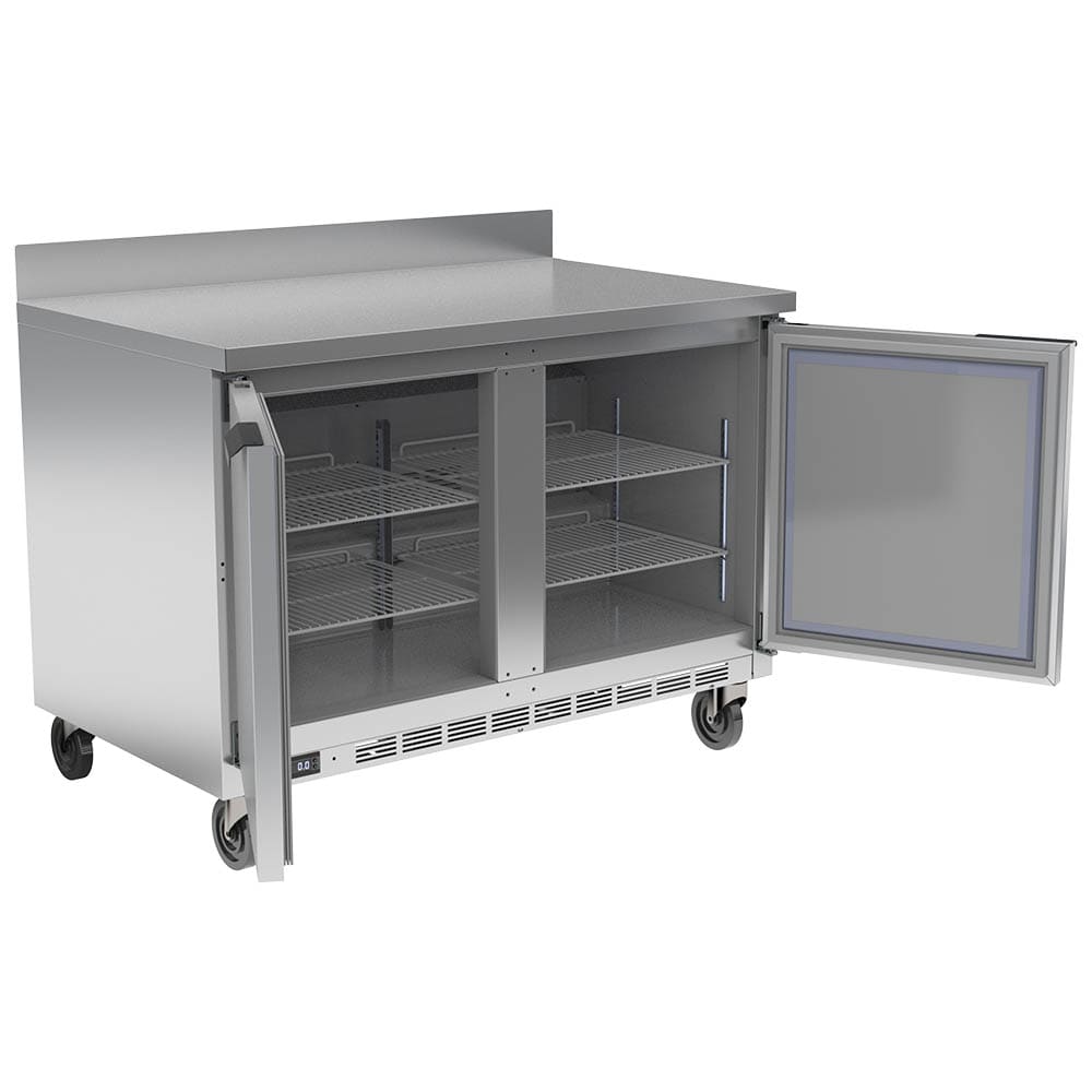 Worktop Freezer, two-section, 48″W, 11.04 cu. ft., (2) solid doors, (4) shelves, snap-in door gaskets, stainless steel front, 2-1/2″ thick top & sides, aluminum interior, 4″ foamed-in place backsplash, rear-mounted self-contained refrigeration, R290 Hydrocarbon refrigerant, 1/2 HP, cULus, UL EPH Classified, UL-Sanitation, Made in USA
