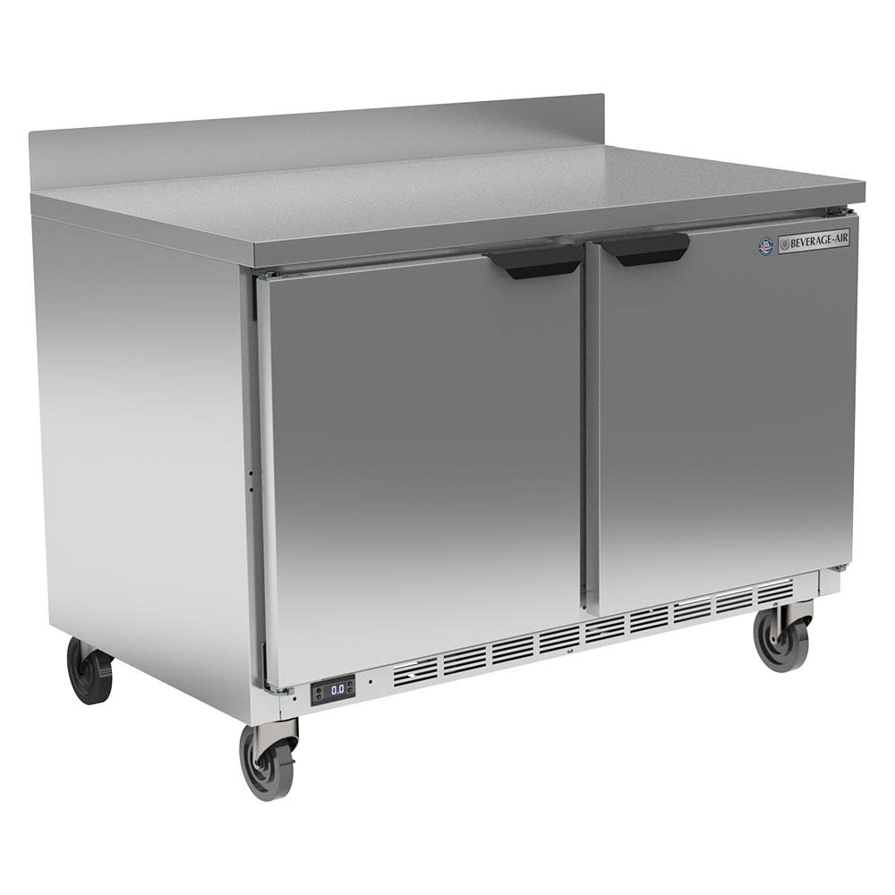 To facilitate loading the cabinet, the two doors on the Beverage Air WTF48AHC-FIP worktop freezer can be propped open. Preventing cold air from escaping, these doors self-close and seal shut with magnetic gaskets to reduce energy costs. Electronic controls enable adjustment to the temperature, which can cool at levels lower than 0 degrees Fahrenheit. To monitor this number, operators can view the internal thermometer.