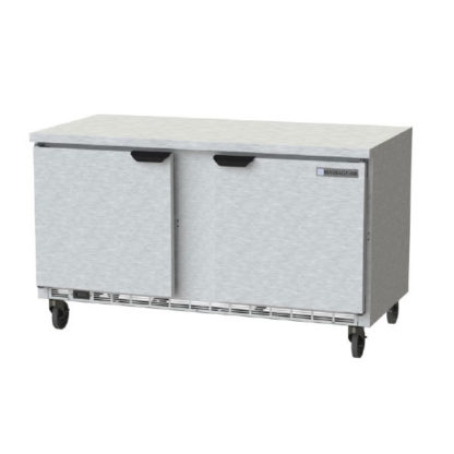 Worktop Freezer, two-section, 60″W, 14.39 cu. ft., (2) solid doors, (4) shelves, snap-in door gaskets, stainless steel front, 2-1/2″ thick top & sides, aluminum interior, flat top, rear-mounted self-contained refrigeration, R290 Hydrocarbon refrigerant, 1/2 HP, cULus, UL EPH Classified, UL-Sanitation, Made in USA