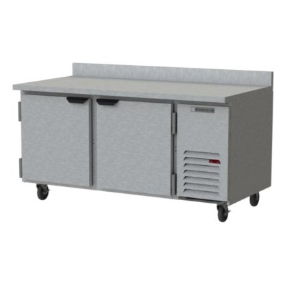 The Beverage Air WTF67AHC worktop freezer has two sections accessed by two solid doors, and it has an interior space of 20.08 cubic feet to hold product. Facilitating cabinet loading, the doors can be propped open, and they self-close if an employee forgets to shut them. Cooling with environmentally friendly R290 hydrocarbon refrigerant, the self-contained condenser maintains temperatures lower than 0 degrees Fahrenheit.
