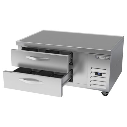 The Beverage Air WTFCS48HC chef base has one section with 8.59 cubic feet of interior space. Each of its two drawers hold two full-size food pans and can withstand 275 pounds without bending or warping. The drawers close on their own if an employee forgets, and they seal shut with one-piece gaskets to prevent cold air from escaping. Because the top is fire proof, it can be used as a work station with hot equipment without sustaining heat damage.