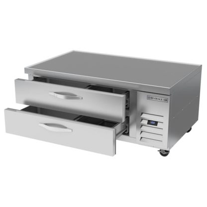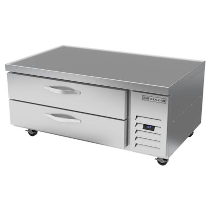 The Beverage Air WTFCS52HC chef base freezer has two drawers that hold as much as 275 pounds without bending. Each drawer accommodates three full-size pans of food, keeping product in the range of -10 degrees Fahrenheit. To streamline installation, the refrigeration system is self-contained, and it cools with eco-friendly R290 hydrocarbon refrigerant.