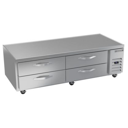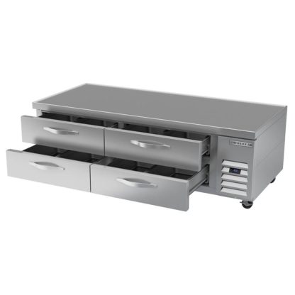 The Beverage Air WTFCS72HC chef base freezer has two sections with four drawers, equaling a total interior space of 14.51 cubic feet. So cold air doesn’t escape the cabinet, the drawers self-close and shut with magnetic gaskets. Delrin rollers on the drawers enable each of them to hold 275 pounds, and they accommodate two full-size food pans. If the unit needs to be relocated throughout the kitchen, it can be rolled on 3-inch casters.
