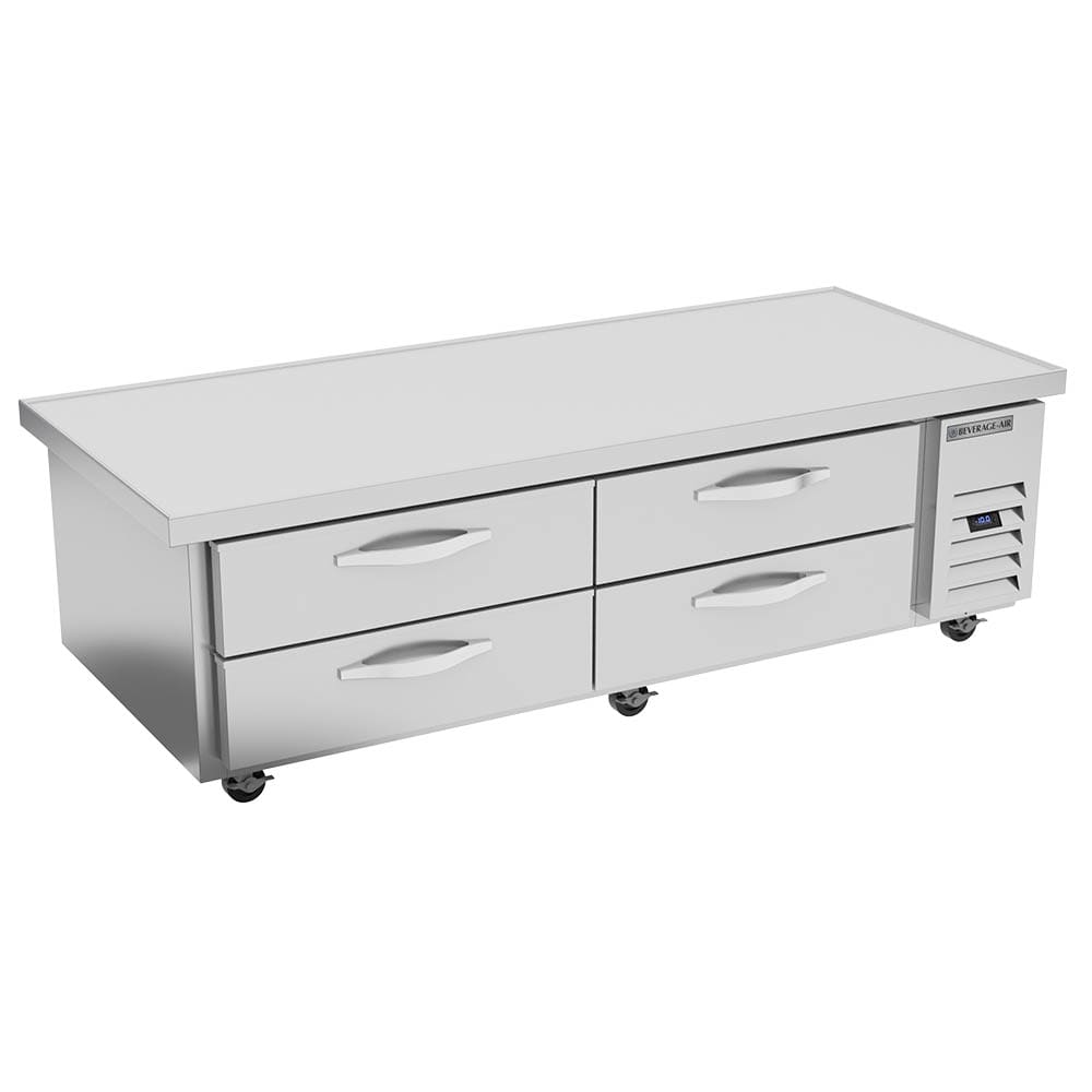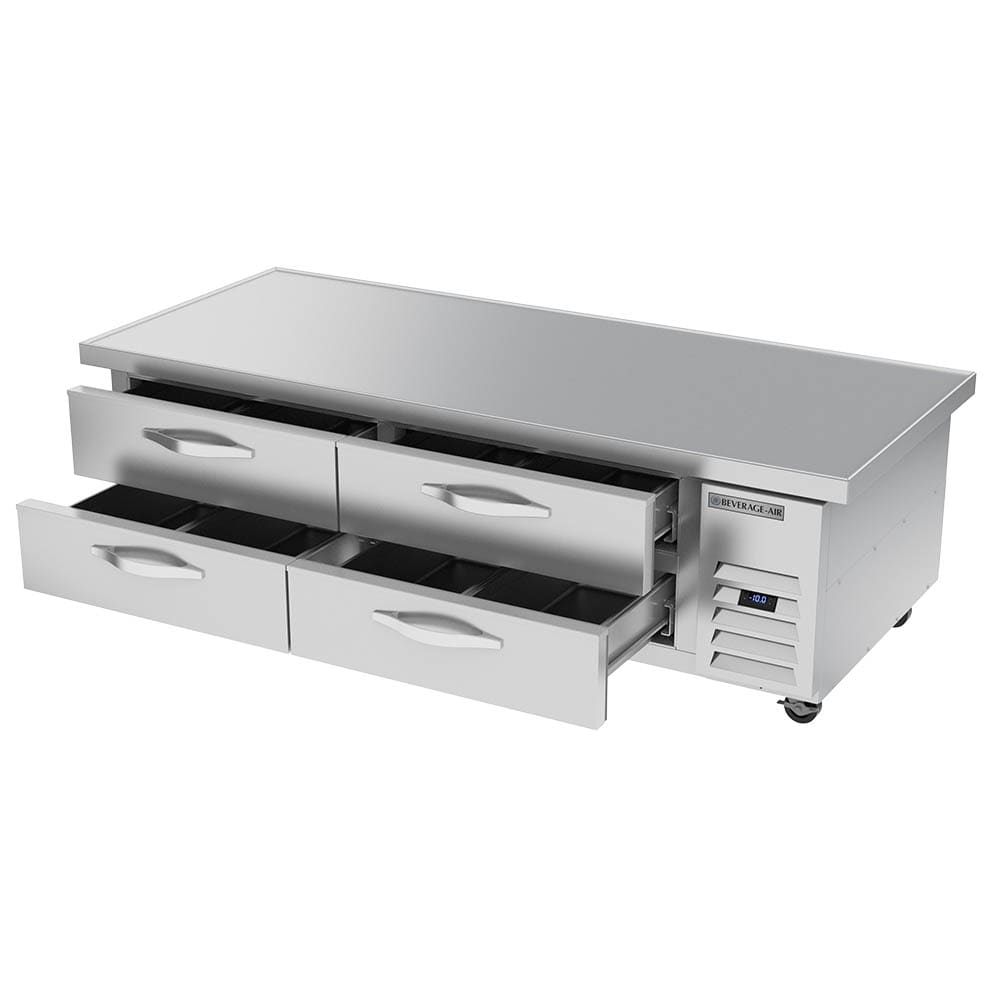 Positioned on 3-inch casters, the Beverage Air WTFCS72HC-76 chef base freezer can be maneuvered through the kitchen or pulled out when employees need to clean underneath it. Two of the casters have brakes to hold the unit still, and with a combined interior space of 14.51 cubic feet, the two sections of this freezer are accessed by four drawers. The drawers hold 275 pounds each and accommodate two full-size food pans.