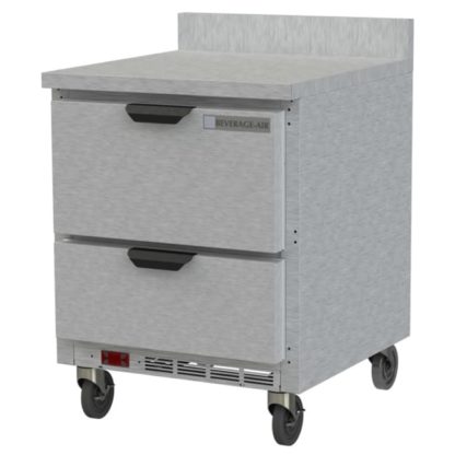 Made of stainless and galvanized steel, the Beverage Air WTFD27AHC-2-FIP one-section undercounter freezer resists rust, dents, and scratches from intensive use. Its stainless steel worktop is 21/2 inches thick, providing a sturdy surface for food prep and assembly without bending or bowing. Each drawer is mounted on a stainless steel frame and holds food pans as deep as 6 inches. To prevent the drawers from falling out of the unit’s front onto a worker’s foot, the telescoping drawer slides have a built-in locking mechanism.
