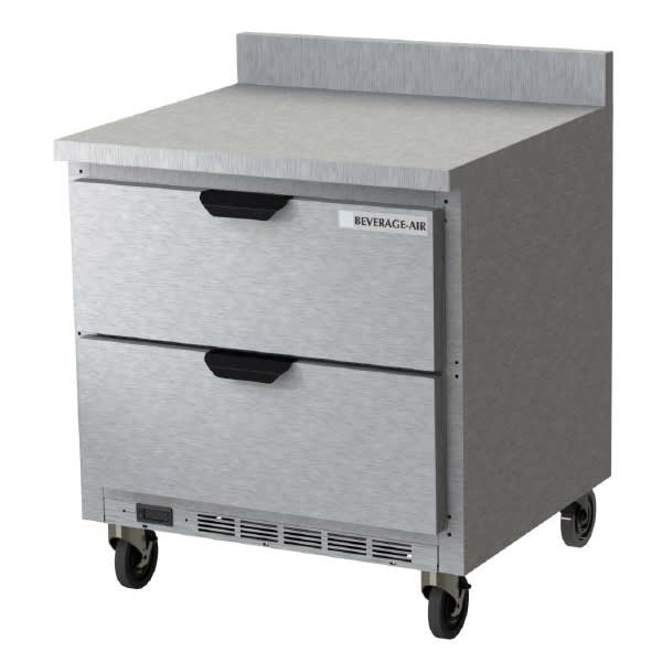 This Beverage Air WTFD32AHC-2-FIP worktop freezer’s stainless steel frame and stainless and galvanized steel exterior resist rust and scratches. Each drawer rests on telescoping slides with safety locks to prevent them from falling out of the cabinet and striking the user’s foot. Reducing condensate, the evaporator coil is coated in epoxy to seal out moisture and increase its life span.