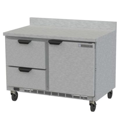 Worktop Freezer, two-section, 48″W, 11.04 cu. ft., (2) drawers, (1) solid door, (2) shelves, snap-in door gaskets, stainless steel front, 2-1/2″ thick top & sides, aluminum interior, 4″ foamed-in place backsplash, rear-mounted self-contained refrigeration, R290 Hydrocarbon refrigerant, 1/2 HP, cULus, UL EPH Classified, UL-Sanitation, MADE IN USA