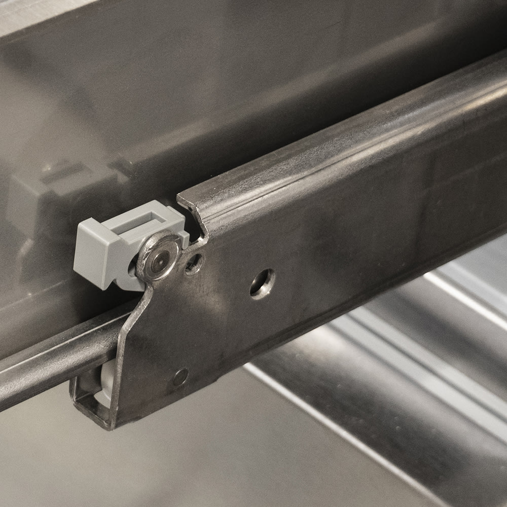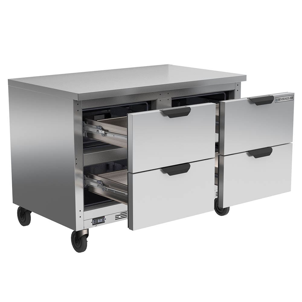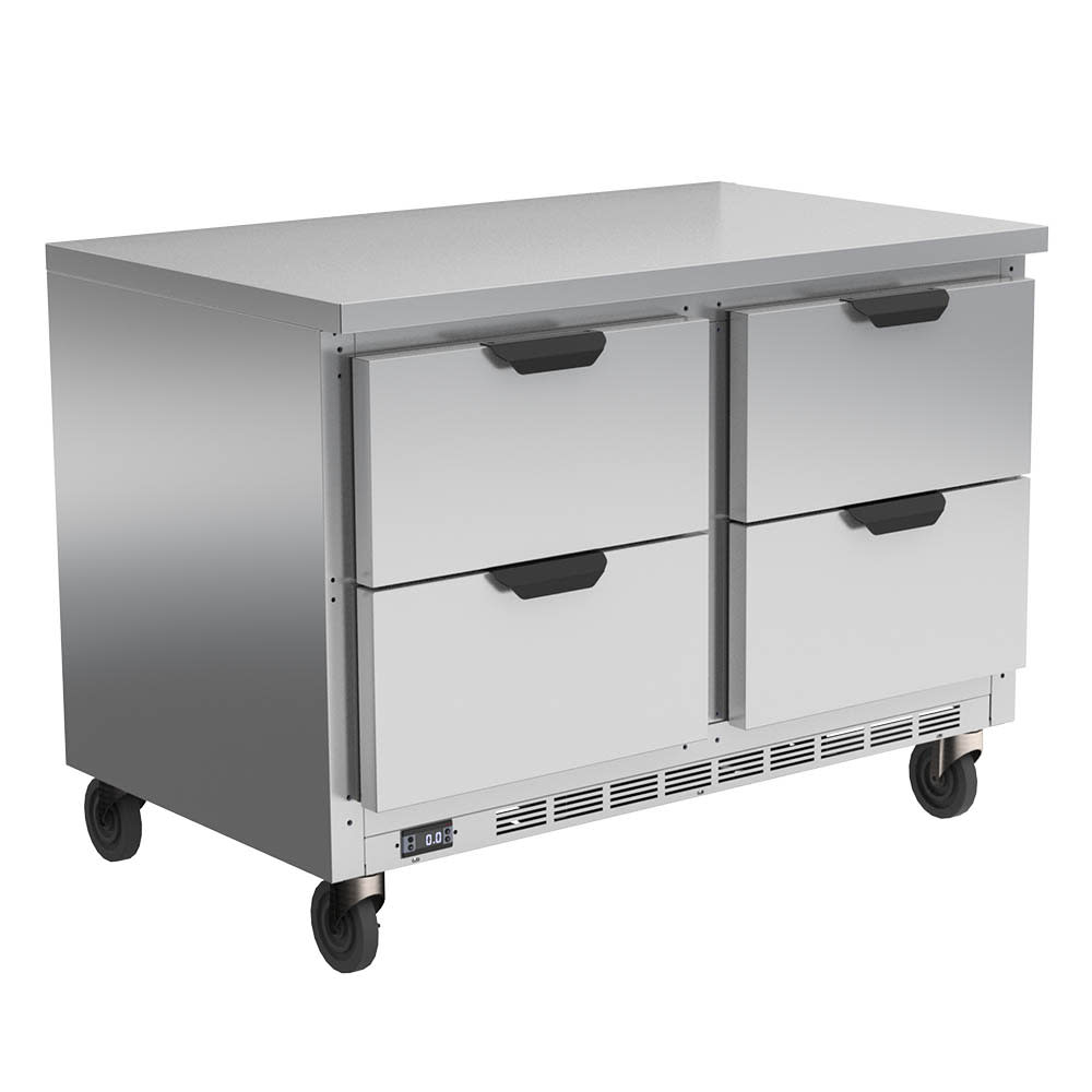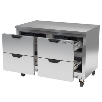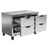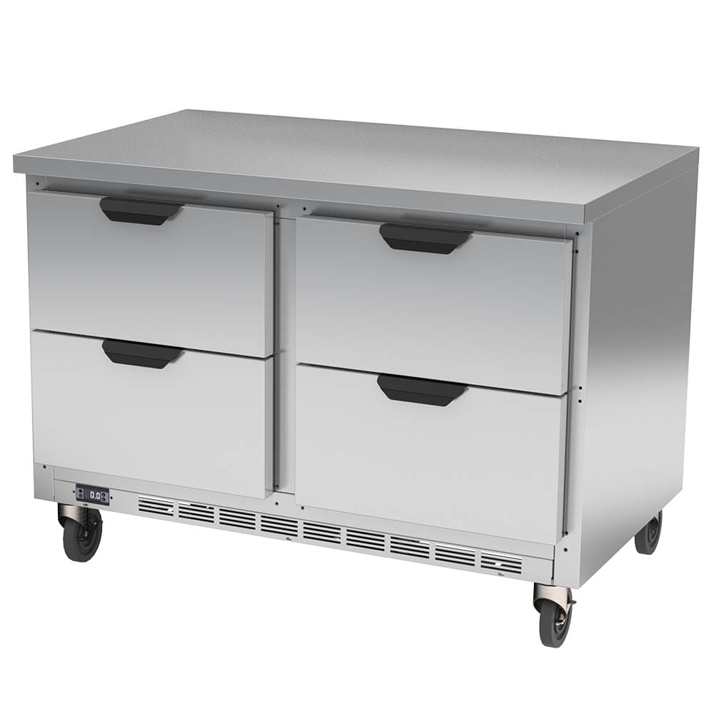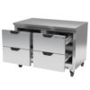 Worktop Freezer, two-section, 48″W, 11.04 cu. ft., (4) drawers, stainless steel front, 2-1/2″ thick top & sides, aluminum interior, flat top, rear-mounted self-contained refrigeration, R290 Hydrocarbon refrigerant, 1/2 HP, cULus, UL EPH Classified, UL-Sanitation, MADE IN USA