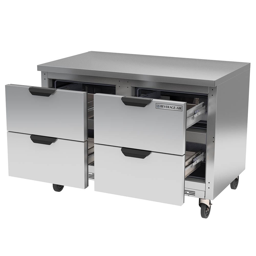 Enabling users to comfortably transport the Beverage Air WTFD48AHC-4-FLT two-section freezer, the entire unit is mounted on 6-inch casters. It offers 11.04 cubic feet of interior space divided into two sections, each with two slide-out drawers. To prevent them from falling out of the cabinet, these drawers are kept in place with a secure locking mechanism.