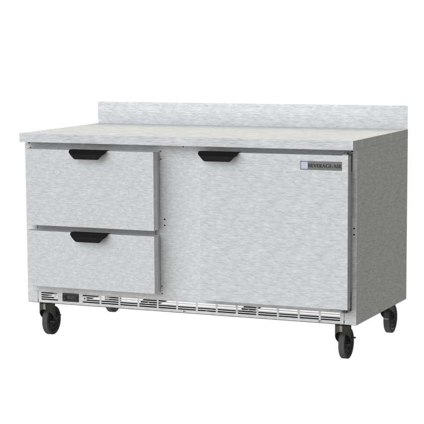 Worktop Freezer, two-section, 60″W, 14.39 cu. ft., (2) drawers, (1) solid door, (2) shelves, snap-in door gaskets, stainless steel front, 2-1/2″ thick top & sides, aluminum interior, 4″ foamed-in place backsplash, rear-mounted self-contained refrigeration, R290 Hydrocarbon refrigerant, 1/2 HP, cULus, UL EPH Classified, UL-Sanitation, MADE IN USA
