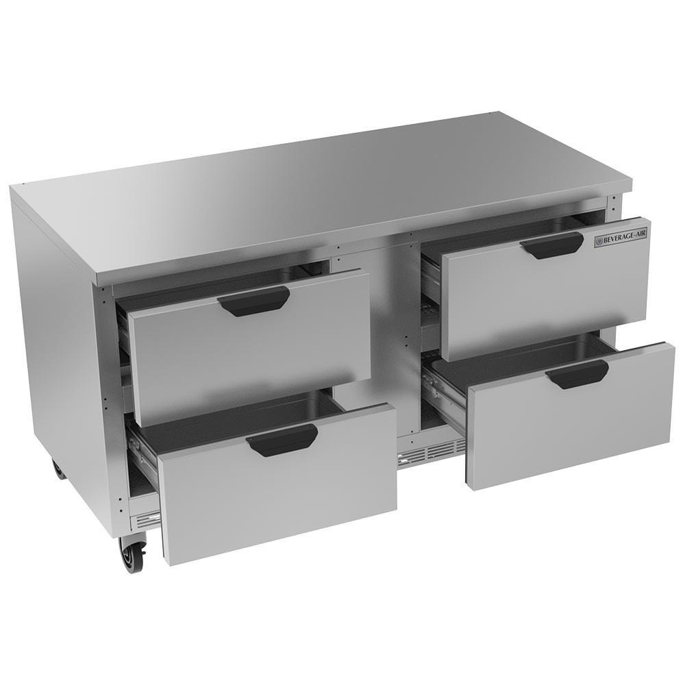 The Beverage Air WTFD60AHC-4-FLT worktop freezer offers 14.39 cubic feet of interior space divided into two sections. Its four drawers accommodate pans with a depth of 6 inches and are kept from sliding completely out of the cabinet with a secure locking mechanism. This unit is mounted on casters, enabling users to comfortably transport it for service or cleaning.
