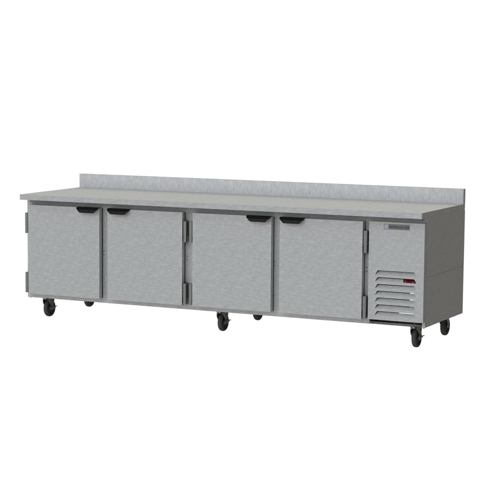 Worktop Refrigerator, four-section, 119″W, 40.12 cu. ft., (4) doors, (8) shelves, stainless steel front, 2-1/2″ thick top & sides, aluminum interior, 4″ H built-in backsplash, side-mounted self-contained refrigeration, R290 Hydrocarbon refrigerant, 1/3 HP, cULus, UL EPH Classified, UL-Sanitation, Made in USA