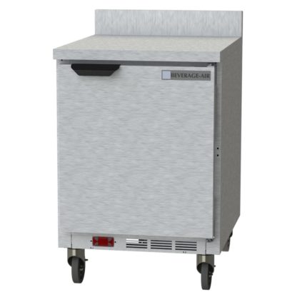 To streamline cleanup and protect walls from splatter, the Beverage Air WTR24AHC-FIP one-section refrigerator is designed with a 4-inch built-in backsplash. It offers 5.16 cubic feet of interior space and a single self-closing, field-reversible door. This unit is mounted on casters so that operators can comfortably maneuver it between locations.
