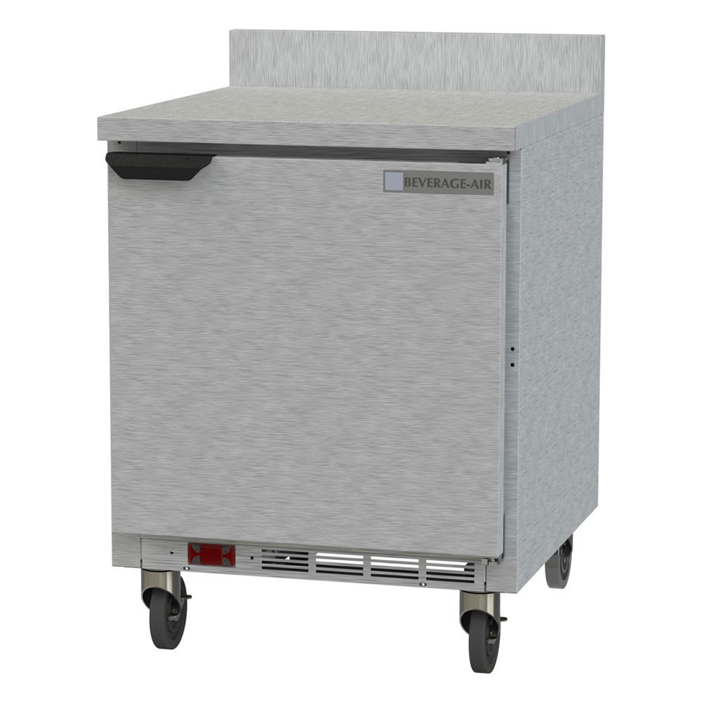 The Beverage Air WTR27AHC-FIP worktop refrigerator helps users optimize their kitchen space. Its single cabinet and stainless steel exterior provide cold storage and a work surface. This unit’s self-contained refrigeration system is mounted in the rear and effectively maintains temperatures between 36 and 38 degrees Fahrenheit.
