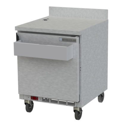 Worktop Refrigerator, one-section, 27″W, 6.13 cu. ft., (1) solid door, (2) shelf, interior thermometer, modified stainless steel top with holes for milk tubing lines, includes speed rail, stainless steel front, sides, door & grille, aluminum interior, 4″ removable backsplash, rear-mounted self-contained refrigeration, R290 Hydrocarbon refrigerant, 1/10 HP, cULus, UL EPH Classified, UL-Sanitation, Made in USA