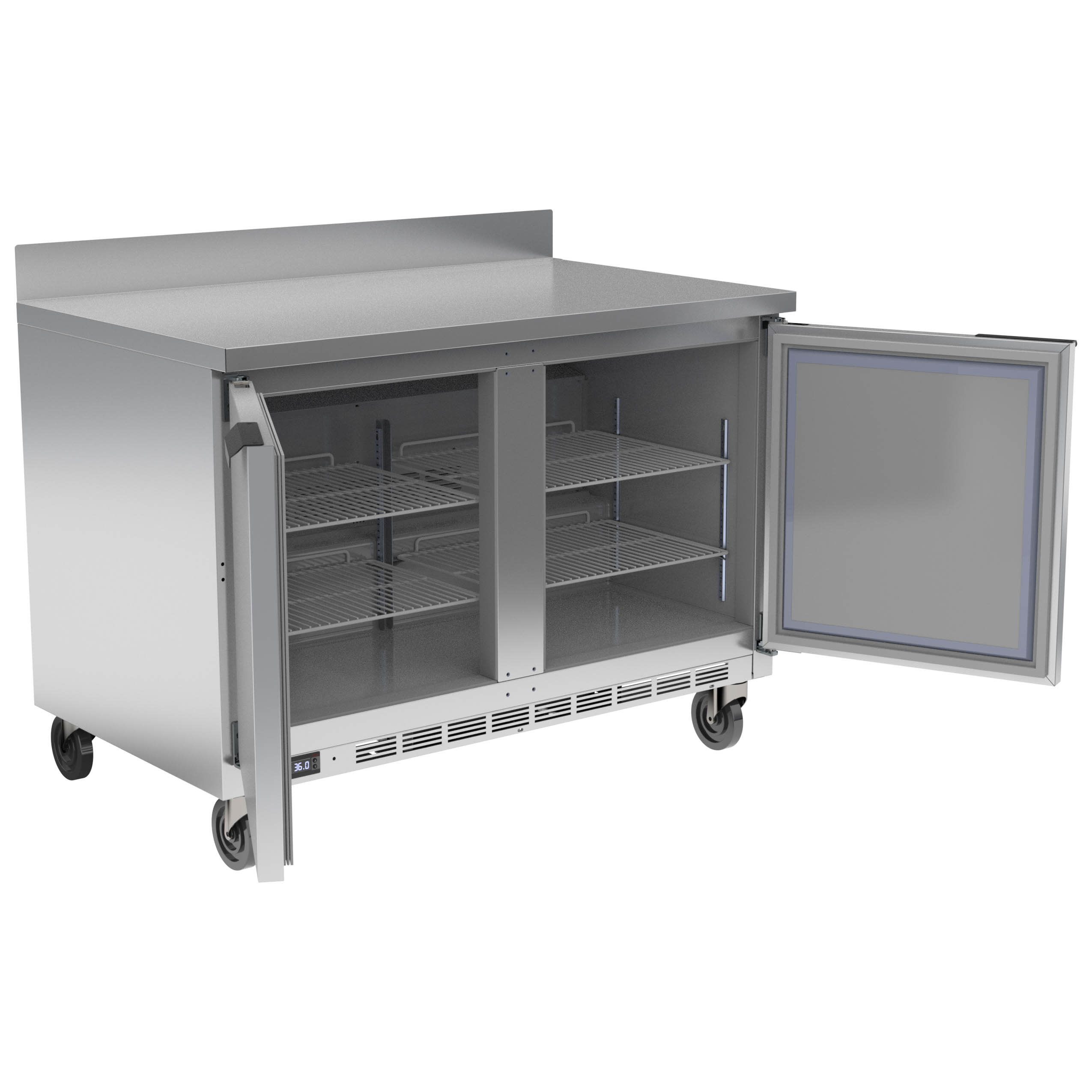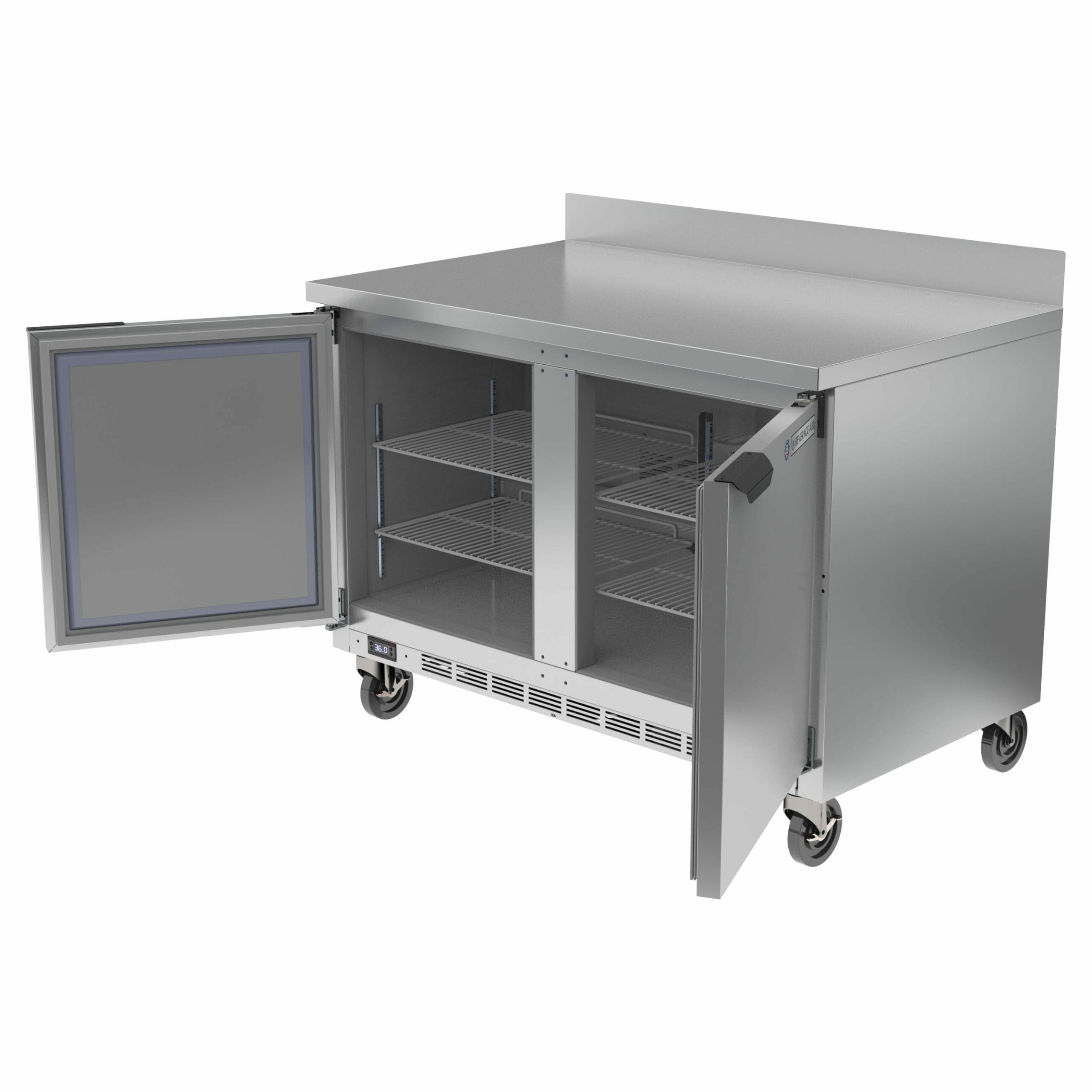 Worktop Refrigerator, two-section, 48″W, 11.82 cu. ft., (2) solid doors, (4) shelves, vertical thermometer, stainless steel front, 2-1/2″ thick top & sides, aluminum interior, 4″ foamed-in place backsplash, rear-mounted self-contained refrigeration, R290 Hydrocarbon refrigerant, 1/6 HP, cULus, UL EPH Classified, UL-Sanitation, Made in USA