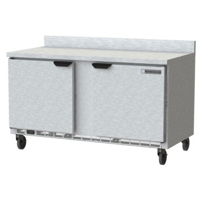 Worktop Refrigerator, two-section, 60″W, 14.75 cu. ft., (2) solid doors, (4) shelves, stainless steel front, 2-1/2″ thick top & sides, aluminum interior, 4″ foamed-in place backsplash, rear-mounted self-contained refrigeration, R290 Hydrocarbon refrigerant, 1/5 HP, cULus, UL EPH Classified, UL-Sanitation, Made in USA