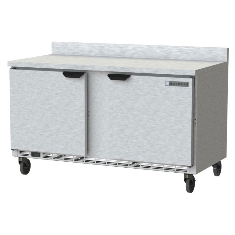To ensure a long lifespan with intensive use, the exterior of the Beverage Air WTR60AHC-FIP worktop refrigerator is constructed primarily of scratch- and dent-resistant stainless steel. It features two field-reversible, self-closing doors as well as a foamed-in-place backsplash to protect walls and surrounding equipment from splatter. This unit is mounted on casters, so it can be wheeled to a different location for maintenance or cleaning.