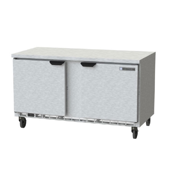 Worktop Refrigerator, two-section, 60″W, 14.75 cu. ft., (2) solid doors, (4) shelves, stainless steel front, 2-1/2″ thick top & sides, aluminum interior, flat top, rear-mounted self-contained refrigeration, R290 Hydrocarbon refrigerant, 1/5 HP, cULus, UL EPH Classified, UL-Sanitation, Made in USA