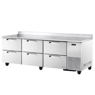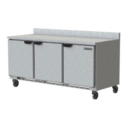 Worktop Refrigerator, three-section, 72″W, 17.88 cu. ft., (3) solid doors, (6) shelves, stainless steel front, 2-1/2″ thick top & sides, aluminum interior, 4″ foamed-in place backsplash, rear-mounted self-contained refrigeration, R290 Hydrocarbon refrigerant, 1/5 HP, cULus, UL EPH Classified, UL-Sanitation, Made in USA