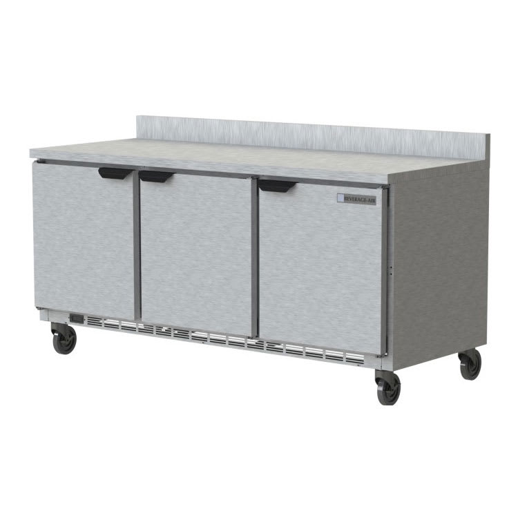 Using environmentally friendly R290 refrigerant, the Beverage Air WTR72AHC-FIP worktop refrigerator maintains temperatures from 36 to 38 degrees Fahrenheit. Its interior thermometer and fully electronic controls enable operators to adjust and monitor temperatures. This unit offers 17.88 cubic feet of interior space, divided into three sections with three self-closing doors.