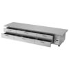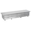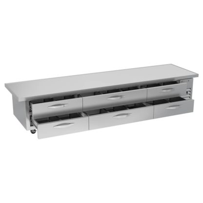 Worktop Cook Stand Refrigerator, three-section, 120″W, 24.36 cu. ft., (6) drawers, left side & right side drawers hold (2) 12″ x 20″ x 6″ pans & center drawers hold (3) 12″ x 20″ x 4″ pans (NOT included), fire-proof stainless steel top, front & sides (no heat shield required), full marine drip guard, aluminum interior, side-mounted self-contained refrigeration, R290 Hydrocarbon refrigerant, 1/3 HP, cULus, UL EPH Classified, UL-Sanitation, Made in USA