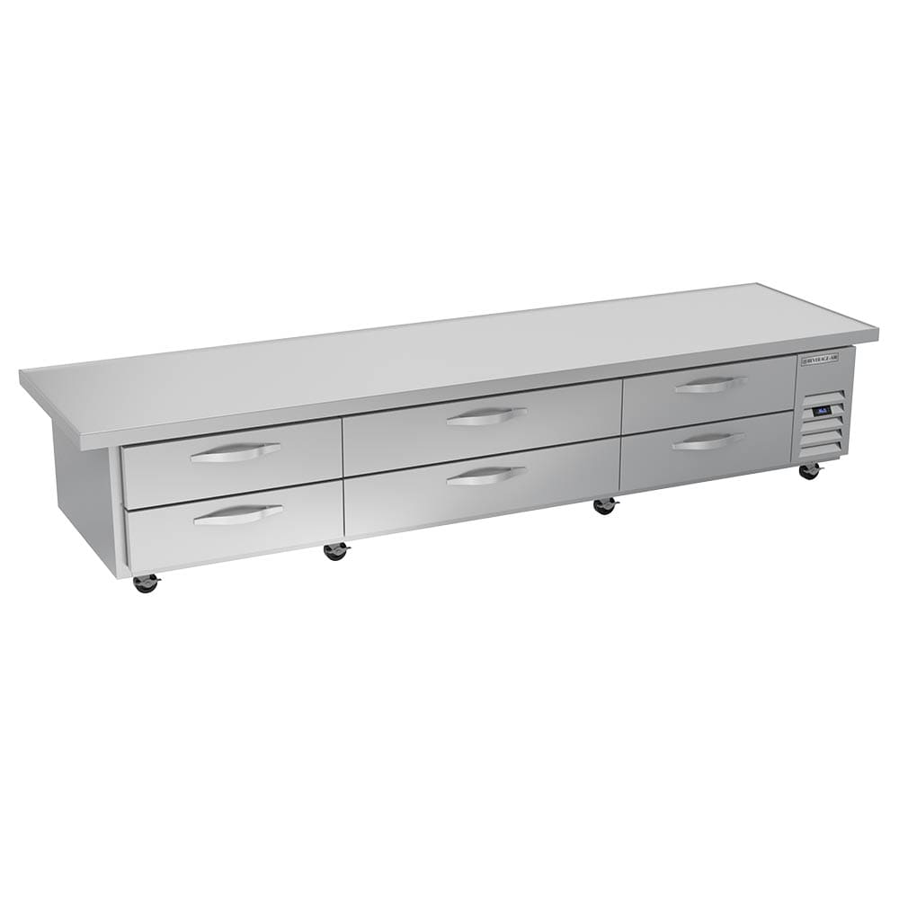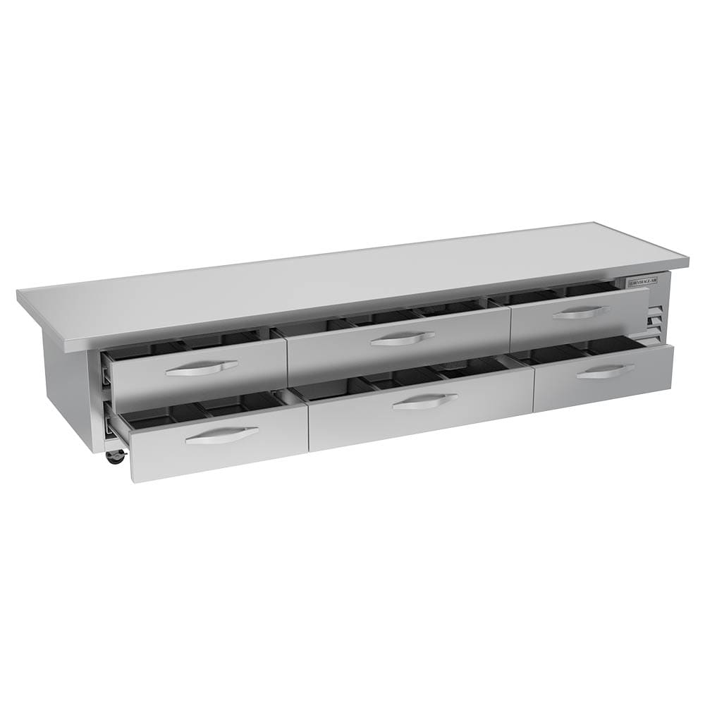 To prevent spills and streamline cleaning, the Beverage Air WTRCS112HC-120 chef base features a protective full marine edge. Its 12-gauge stainless steel top is ideal for accommodating griddles or charbroilers, as it doesn’t require a heat shield. Each of this unit’s six drawers self-close and feature snap-in, magnetic gaskets to prevent cold air from escaping.