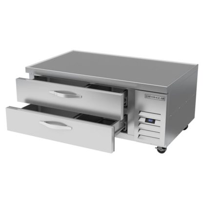 The self-contained refrigeration system of the Beverage Air WTRCS52HC chef’s base refrigerator maintains an internal temperature from 36 to 38 degrees Fahrenheit, preserving the freshness of stored food items. Both self-closing drawers are constructed with 12-gauge stainless steel slides and rollers that can support 275 pounds, ensuring long-lasting performance. This unit’s top is surrounded by a full marine edge that contains liquids and prevents messy dripping from unexpected spills.
