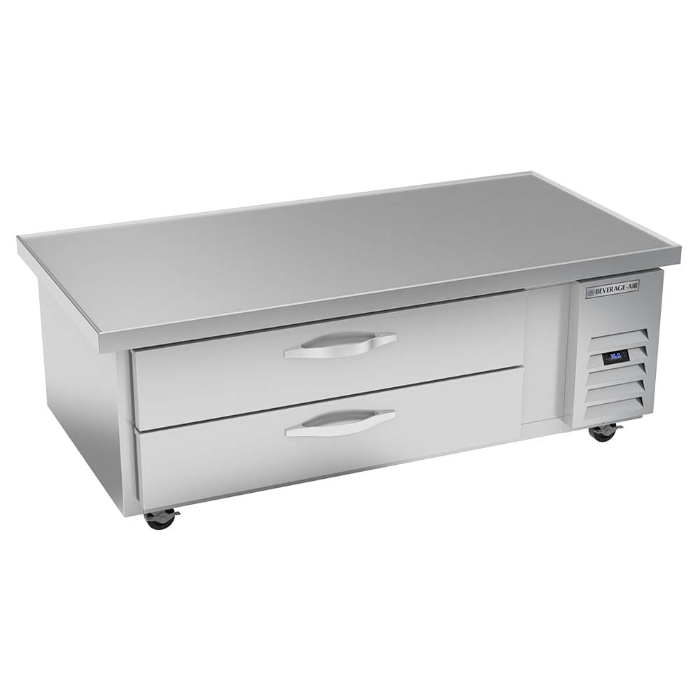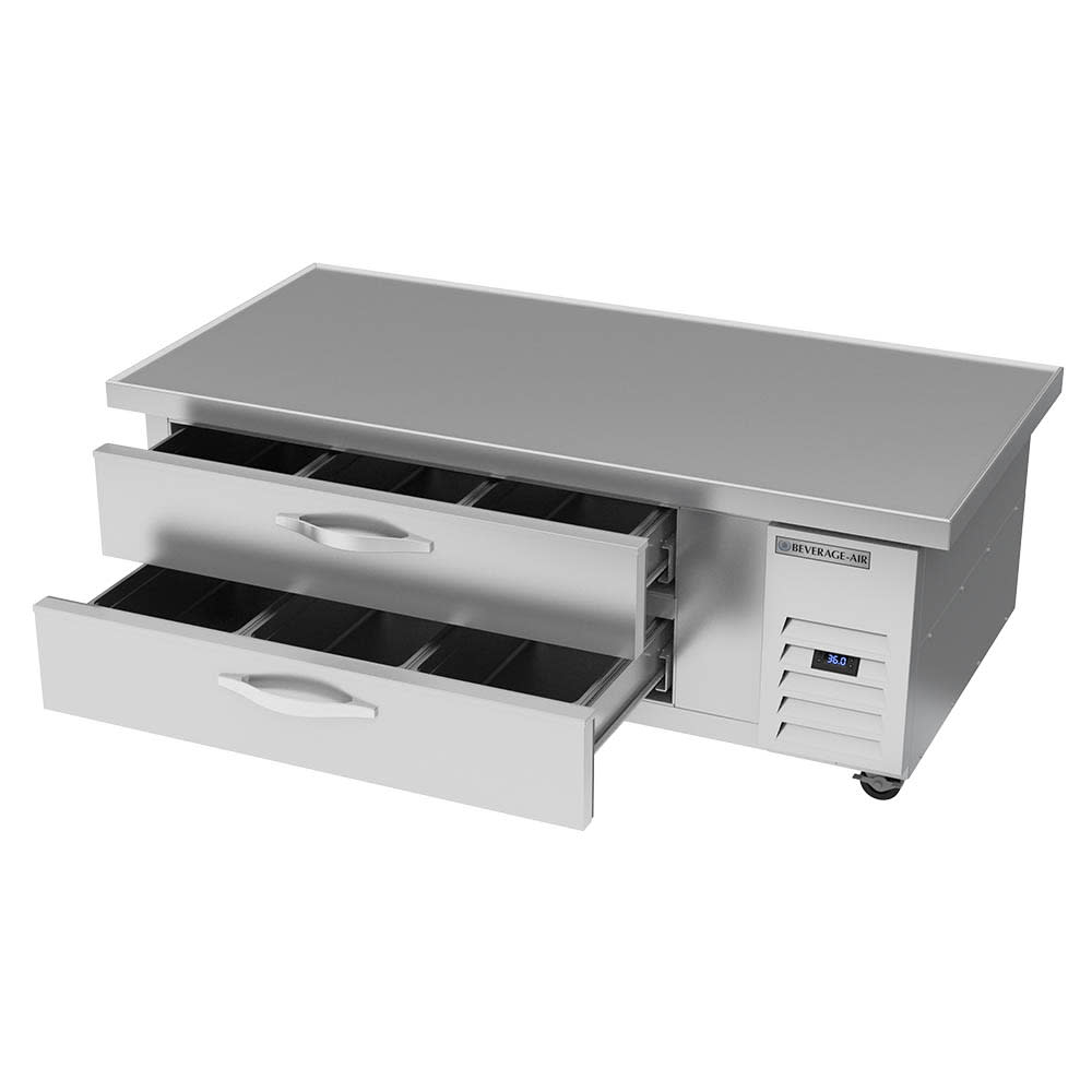 The Beverage Air WTRCS60HC-64 chef base has a temperature holding range of 36 to 38 degrees Fahrenheit and features snap-in, magnetic drawer gaskets to seal in cold air. Its two self-closing drawers accommodate 6-inch-deep, full-size food pans. The interior is constructed of aluminum, a durable and lightweight metal that can withstand exposure to moisture without corroding. This unit offers 11.55 cubic feet of interior space in a single section.