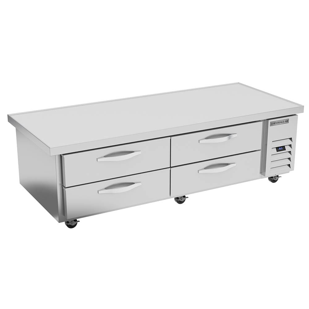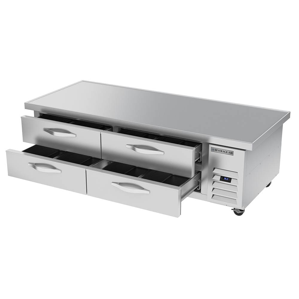 To ensure longevity with intensive use, the Beverage Air WTRCS72HC-76 chef base features a corrosion-resistant, aluminum interior and an exterior constructed largely of stainless steel. Its full marine edge prevents spills from dripping over the side and its top can accommodate hot equipment without a heat shield. This unit maintains temperatures from 36 to 38 degrees Fahrenheit and features snap-in, magnetic drawer gaskets to prevent cold air from escaping.