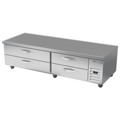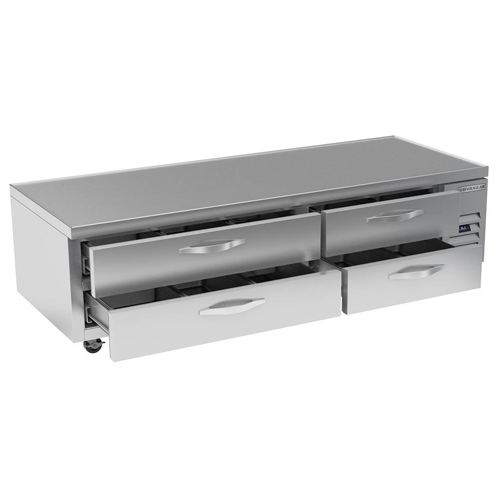 The Beverage Air WTRCS84HC chef base offers 17.46 cubic feet of interior space divided into two sections. Each of its four drawers are self-closing and fitted with snap-in, magnetic gaskets to prevent cold air from leaking. Because the unit is mounted on casters, it can be wheeled between locations smoothly and comfortably for maintenance or cleaning.