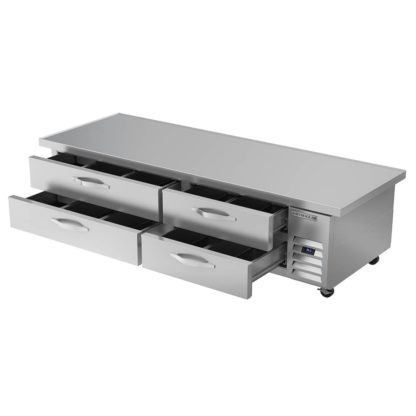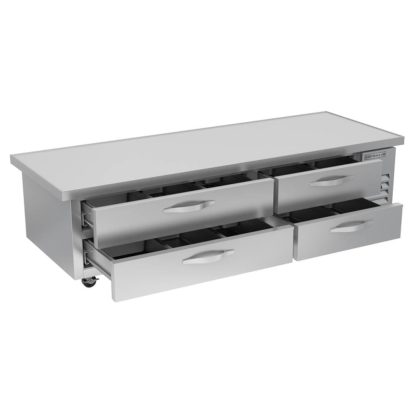 Worktop Cook Stand Refrigerator, two-section, 89″W, 17.5 cu. ft., (4) drawers, top drawer holds (3) left & (2) right) 12″ x 20″ x 6″ pans & bottom drawer holds (3) left & (2) right) 12″ x 20″ x 6″ pans (NOT included), fire-proof stainless steel top, front & sides (no heat shield required), full marine drip guard, aluminum interior, side-mounted self-contained refrigeration, R134a refrigerant, 1/3 HP, cULus, UL EPH Classified, UL-Sanitation, Made in USA