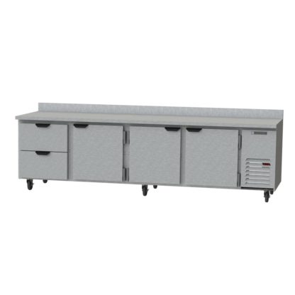 Worktop Refrigerator, four-section, 35-1/2″ working height, 119″W, 40.12 cu. ft., with (2) drawers & (3) doors, (6) shelves, stainless steel exterior & top, with rear splash, aluminum interior, side-mounted self-contained refrigeration, R290 Hydrocarbon refrigerant, 1/3 HP, cULus, UL EPH Classified, UL-Sanitation, MADE IN USA