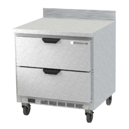 The Beverage Air WTRD32AHC-2 worktop refrigerator has two drawers that can each accommodate a full-size, 6-inch-deep food pan. A locking mechanism prevents the drawers from sliding all the way out of the cabinet when they’re opened. A self-contained refrigeration system chills products in the drawers using eco-friendly R290 hydrocarbon refrigerant.
