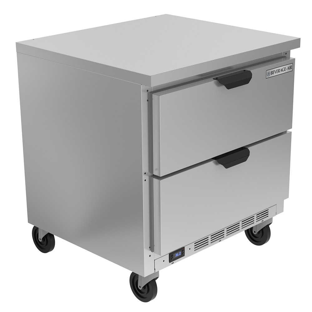 The Beverage Air WTRD32AHC-2-FLT worktop refrigerator uses a self-contained refrigeration system to produce temperatures from 36-38 degrees Fahrenheit. This system is mounted in the back of the cabinet to maximize the storage space in front. Because the refrigerator is mounted on casters, the condenser can be accessed by rolling the unit away from its installation spot.
