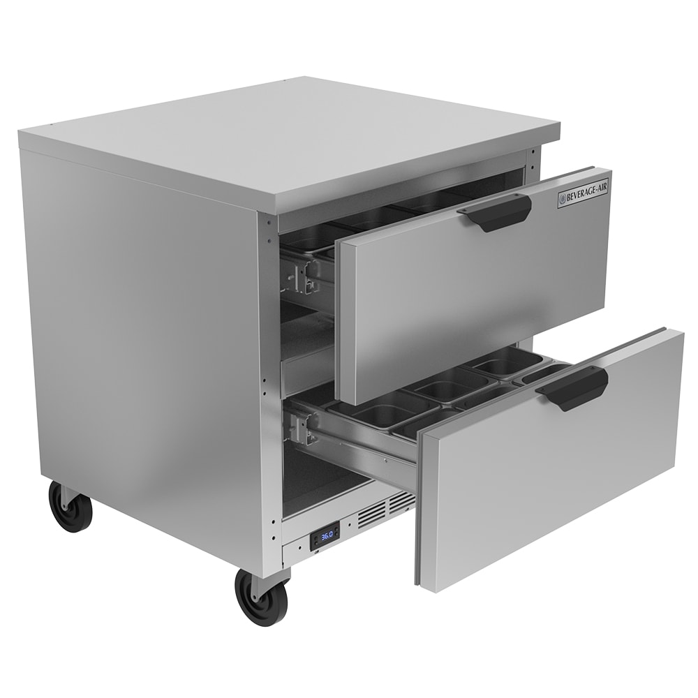 The Beverage Air WTRD32AHC-2-FLT worktop refrigerator has a single section with two drawers. These drawers can each hold a full-size food pan full of fresh or prepared ingredients. The top of the unit, which is constructed of durable stainless steel, is flat so it can support equipment or be used for food prep.