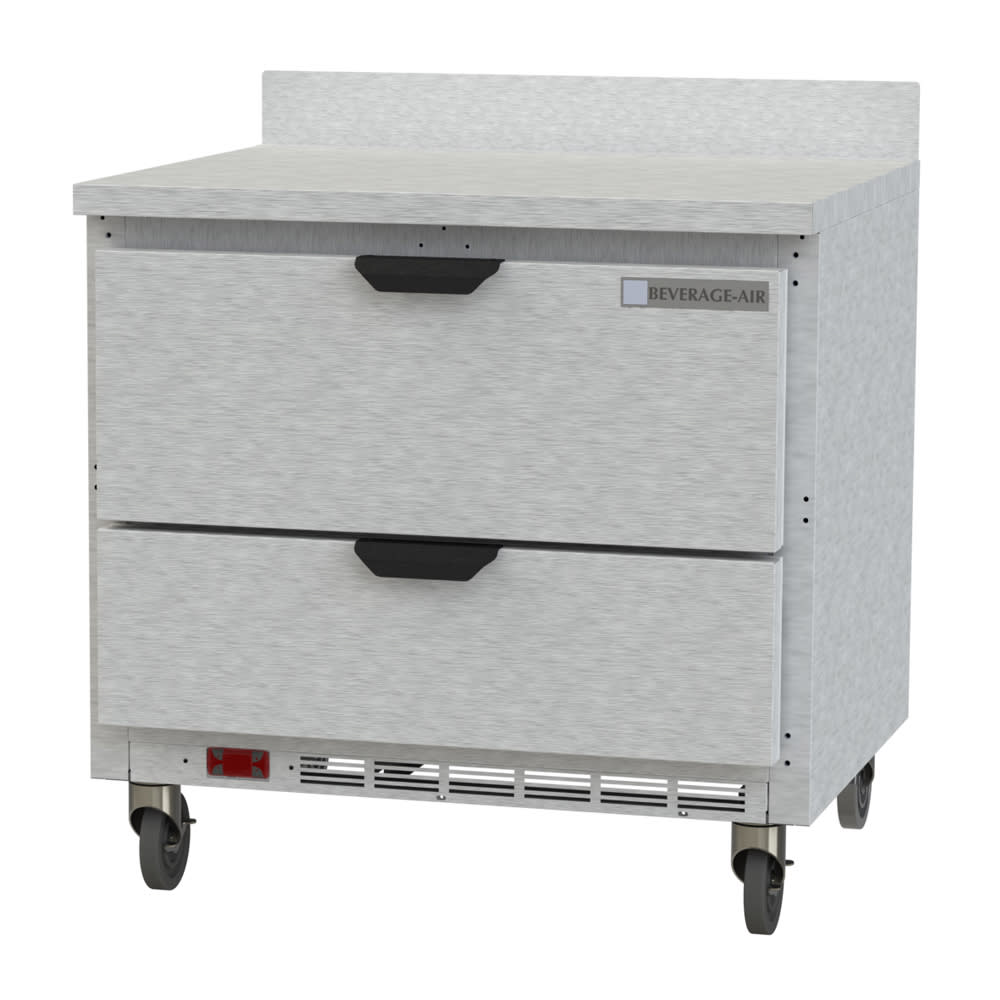 The Beverage Air WTRD36AHC-2 worktop refrigerator has a stainless steel top with a backsplash. This backsplash can be removed when it needs to be wiped clean. Because the unit is mounted on casters, it can be moved whenever the area around it needs to be cleaned or when the refrigerator needs to be serviced.