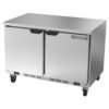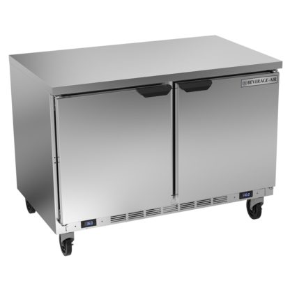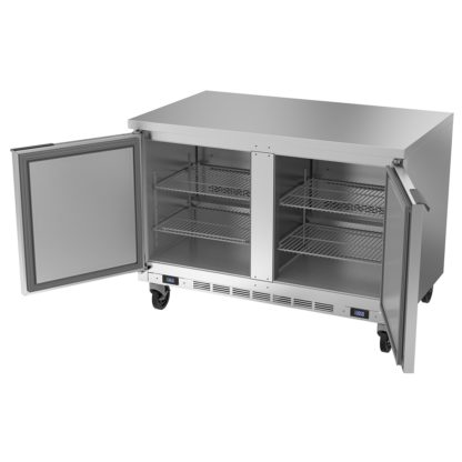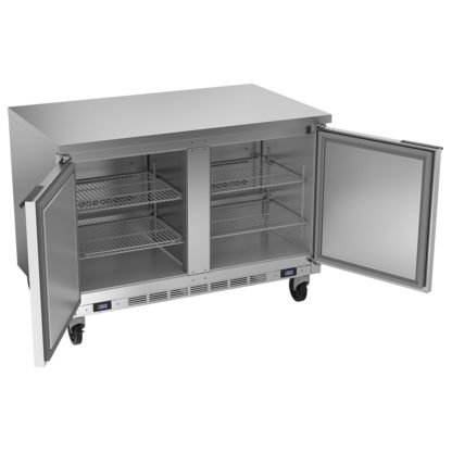 Worktop Refrigerator/Freezer, two-section, 48″W, 12.6 cu. ft., (2) solid reversible hinged doors, (4) adjustable wire shelves, flat top, interior thermometer, automatic defrost, stainless steel exterior & top, aluminum interior, (2) rear-mounted self-contained refrigeration systems, 4″ H removable backsplash, R290 Hydrocarbon refrigerant, 1/6 HP refrigerator, 1/4 HP freezer, cULus, UL EPH, UL-Sanitation, MADE IN USA