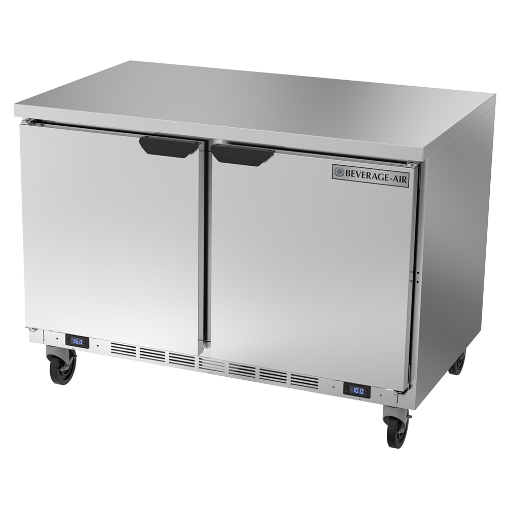 The Beverage Air WTRF48AHC-1-SA-A-FLT worktop combination refrigerator freezer has two solid doors to help keep food insulated. To adjust to various floor plans, the doors can be reversed to open from either side. An interior thermometer measures the temperature inside the unit, while its automatic defrost function runs without instigation from the user to reduce employee labor.