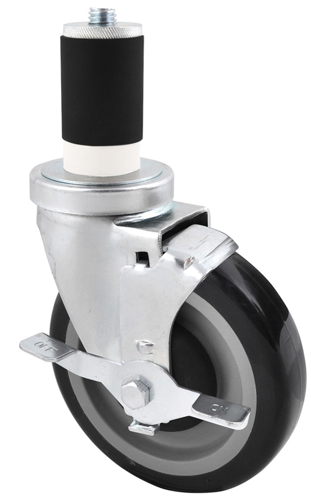 Caster Kit, work table POP box, includes (4) 5″ diameter expanding stem, Fits 1-5/8″ OD tubing, non-marking polyurethane tread, top lock brake, 300 lb. capacity, resistant to acids & caustics, double ball bearing, operational temp range -45° to 180° F, zinc plated