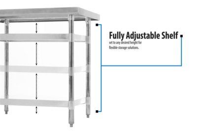 Work Table, 72″W x 30″D, 18/430 stainless steel top, with turndown edges on front & sides, reinforced with channels, 5″ backsplash, adjustable galvanized undershelf, 1-5/8″ dia. galvanized legs, adjustable high-impact corrosion-resistant feet