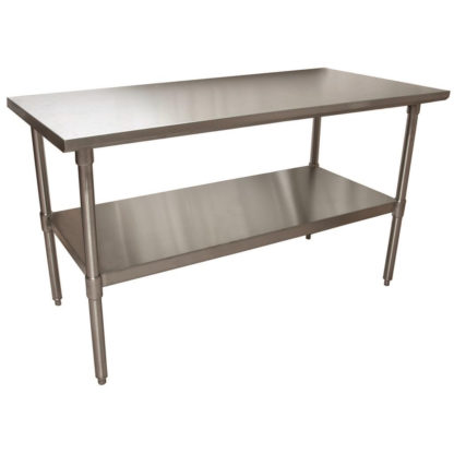 Work Table, 60″W x 30″D, 18/430 stainless steel top, with turndown edges on all sides, reinforced with channels, adjustable galvanized undershelf, 1-5/8″ dia. galvanized legs, adjustable high-impact corrosion-resistant feet, NSF