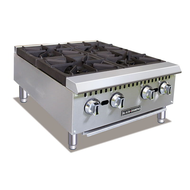 Black Diamonds 4 burner heavy duty gas countertop hotplates is constructed of stainless steel front and sides that are fully welded and able to stand the toughest of kitchen environments. Each burner puts out 25,000 BTU/hour with two cast iron burners for every 12″ grate width. Units come standard with 4-5″ adjustable legs, separate gas valves for each burner with standing pilot lights and a 3/4″ rear NPT gas inlet. Set up for use with Natural Gas (NG). 1 year warranty on parts and labor. ETL Listed and ETL Sanitation.